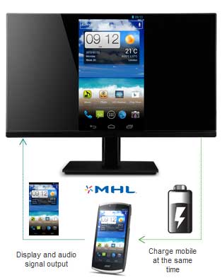 Available on selected models is the new MHL (Mobile High Definition Link) technology. This technology allows you to connect a mobile device like a smartphone or media player to this monitor and play content from the mobile device without having to do any setup procedures. This cable connection also charges the battery of the mobile device while the media is being played.