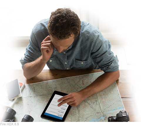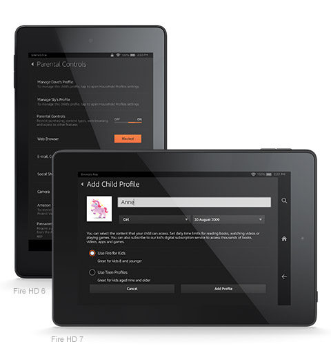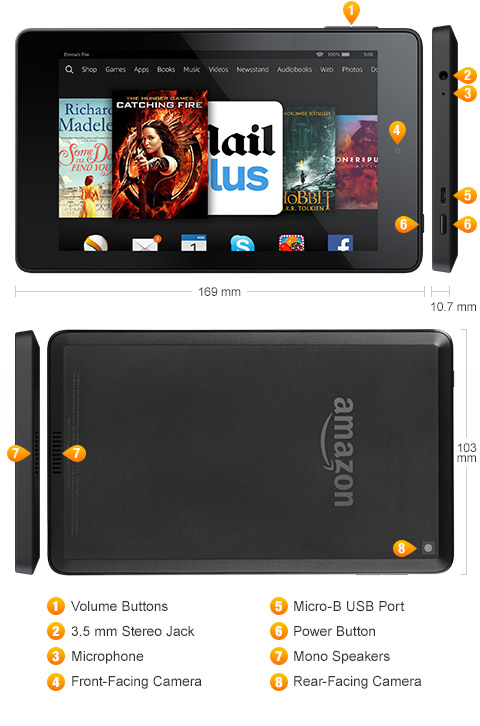 | Display | 6" (15cm) high definition touchscreen; 1280x800 resolution at 252 ppi, video playback up to 720p, with IPS (in-plane switching) technology and advanced polarising filter | | Size | 169mm x 103mm x 10.7mm | | Weight | 290 grams Actual size and weight may vary by configuration and manufacturing process | | CPU & RAM | Quad-Core: 2 @ 1.5 Ghz + 2 @ 1.2 GHz , with 1 GB of RAM | | Storage | 8 GB (4.5 GB available to user) or 16 GB (11.6 GB available to user) of internal storage, plus free, unlimited Cloud storage for all of your Amazon content | | Battery Life | Up to 8 hours of reading, surfing the web on Wi-Fi, watching video or listening to music. Battery life will vary based on device settings, usage and other factors such as web browsing and downloading content. Actual results may vary | | Charge Time | Fully charges in under 6 hours using the micro-USB power adapter included in the box, or slightly longer with other micro-USB power adapters that you may already have | | Wi-Fi Connectivity | Single-antenna Wi-Fi. Supports public and private Wi-Fi networks or hotspots that use the 802.11b, 802.11g, or 802.11n standard with support for WEP, WPA, and WPA2 security using password authentication; does not support connecting to ad-hoc (or peer-to-peer) Wi-Fi networks | | Ports | SlimPort enabled USB 2.0 (micro-B connector) port to connect to an HDTV or VGA monitor with an adaptor or to a PC/Macintosh computer, or to charge your device with the included power adapter | | Audio | 3.5 mm stereo jack and integrated speaker with Dolby Digital Plus audio engine | | Content Formats Supported | Kindle (AZW), KF8, TXT, PDF, unprotected MOBI, PRC natively, Audible Enhanced format (AAX), DOC, DOCX, JPEG, GIF, PNG, BMP, Dolby Digital (AC-3), Dolby Digital Plus (E-AC-3), non-DRM AAC, MP3, MIDI, PCM/WAVE, OGG, WAV, M4V, MP4, AAC LC/LTP, HE-AACv1, HE-AACv2, MKV, AMR-NB, AMR-WB, HTML5, CSS3, 3GP, VP8 (WEBM) | | Sensors | Accelerometer, gyroscope | | Camera Specs | VGA Front-facing Camera. 2.0 MP rear-facing HD camera | | Location Services | Location-based services via Wi-Fi | | Additional Features | External volume controls, built-in Bluetooth with support for A2DP compatible stereo headphones, speakers, microphone and LE accessories support | | Accessibility Features | Screen Reader, Explore by Touch, and Screen Magnifier, enabling access to the vast majority of Fire features. Screen Reader features IVONA's award-winning natural language text-to-speech voice. Also includes adjustable font sizes/colour, and built-in dictionary. | | System Requirements | Fire HD 6 is ready to use right out of the box—no setup, no software to install, no computer required to download content | | Warranty and Service | Fire HD 6 is sold with a worldwide limited warranty of one year provided by the manufacturer. If you are a consumer, the limited warranty is in addition to your consumer rights, and does not jeopardise these rights in any way. This means you may still have additional rights at law even after the limited warranty has expired (for further information on your consumer rights, click here). Use of Fire tablet is subject to the terms found here. | | Included in the Box | Fire HD 6 tablet, USB 2.0 cable, 9W power adapter and Quick Start Guide |