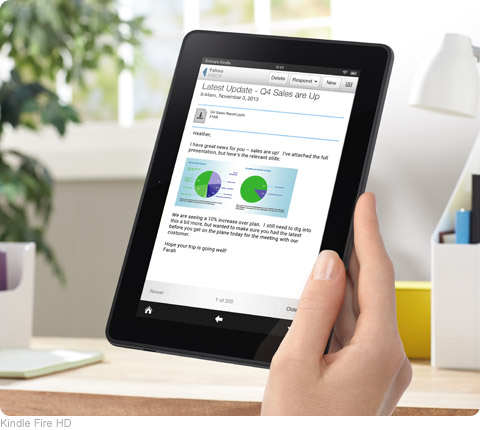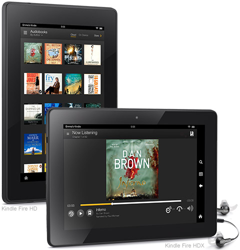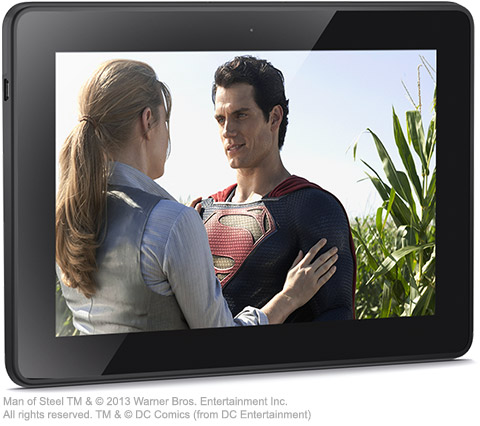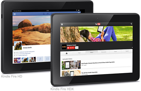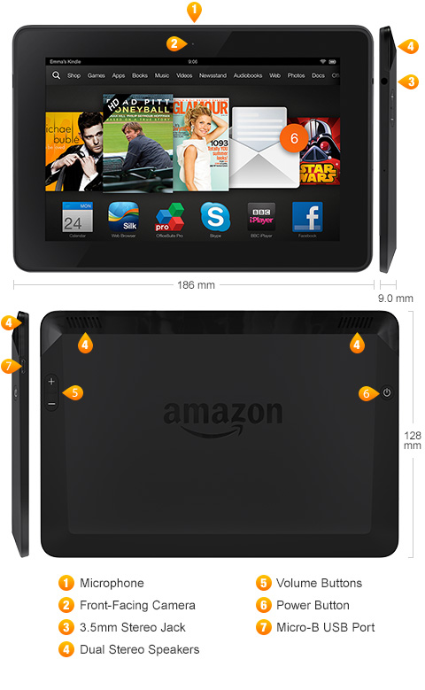 | Display | 7" HDX touchscreen display, with 1920x1200 resolution at 323 ppi, 100% sRGB colour accuracy, video playback up to 1080p, max brightness over 400 nits, Dynamic Image Contrast, reduced glare, and advanced polarizing filter | | Size | 186 mm x 128 mm x 9.0 mm | | Weight | Wi-Fi—303 grams; 4G LTE + Wi-Fi—311 grams Actual size and weight may vary by configuration and manufacturing process | | CPU & RAM | 2.2GHz Quad-core Snapdragon 800 CPU, with Adreno 330 GPU and 2GB of RAM | | Storage | 16GB (10.9GB available to user) or 32GB (25.5GB available to user), or 64 GB (54.3GB available to user) of internal storage, plus Free, unlimited Cloud storage for all of your Amazon content | | Battery Life | Up to 11 hours of reading, surfing the web on Wi-Fi, watching video or listening to music. Up to 17 hours of battery life when only reading. Battery life will vary based on device settings, usage and other factors such as web browsing and downloading content. Actual results may vary | | Charge Time | Fully charges in under 4 hours using the Kindle PowerFast power adapter included in the box, or slightly longer with other micro-USB power adapters that you may already have | | Wi-Fi Connectivity | Dual-band, dual-antenna Wi-Fi (MIMO+HT40) for faster streaming and fewer dropped connections than standard Wi-Fi. Supports public and private Wi-Fi networks or hotspots that use the 802.11a, 802.11b, 802.11g, or 802.11n standard with support for WEP, WPA and WPA2 security using password authentication; does not support connecting to ad-hoc (or peer-to-peer) Wi-Fi networks | | 4G Connectivity | Support for ultra-fast 4G LTE wireless networks with HSPA+, HSDPA, and with Vodafone wireless, EDGE/GPRS fallback. Compatible with other mobile network operators utilizing LTE Band 3 (1800 MHz), Band 7 (2600 MHz), Band 20 (800 MHz). | | Ports | USB 2.0 (micro-B connector) port for connection to a PC or Macintosh computer or to charge your device with the included power adapter | | Audio | 3.5 mm stereo jack and integrated stereo speakers with Dolby Digital Plus audio engine | | Content Formats Supported | Kindle (AZW), KF8, TXT, PDF, unprotected MOBI, PRC natively, Audible Enhanced format (AAX), DOC, DOCX, JPEG, GIF, PNG, BMP, Dolby Digital (AC-3), Dolby Digital Plus (E-AC-3), non-DRM AAC, MP3, MIDI, PCM/WAVE, OGG, WAV, M4V, MP4, AAC LC/LTP, HE-AACv1, HE-AACv2, MKV, AMR-NB, AMR-WB, HTML5, CSS3, 3GP, VP8 (WEBM) | | Sensors | Ambient light sensor, accelerometer, gyroscope, GPS (4G) | | Location Services | Location-based services via Wi-Fi. 4G model also uses assisted-GPS | | Additional Features | External volume controls, front-facing 720p HD camera, built-in dual microphone, built-in Bluetooth with support for A2DP compatible stereo headphones, headsets, and speakers | | Accessibility Features | Screen Reader, Explore by Touch, and Screen Magnifier, enabling access to the vast majority of Kindle Fire features. Screen Reader features IVONA's award-winning natural language text-to-speech voice. Also includes adjustable font sizes/coloUr, and built-in dictionary. Learn more | | System Requirements | Kindle Fire HDX is ready to use right out of the box—no setup, no software to install, no computer required to download content | | Warranty and Service | Kindle Fire HDX is sold with a worldwide limited warranty of one year provided by the manufacturer. If you are a consumer, the limited warranty is in addition to your consumer rights, and does not jeopardise these rights in any way. This means you may still have additional rights at law even after the limited warranty has expired (for further information on your consumer rights, click here). Use of Kindle is subject to the terms found here. | | Included in the Box | Kindle Fire 7" HDX tablet, USB 2.0 cable, 9W PowerFast charger, and Quick Start Guide |