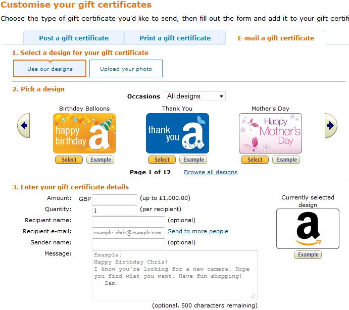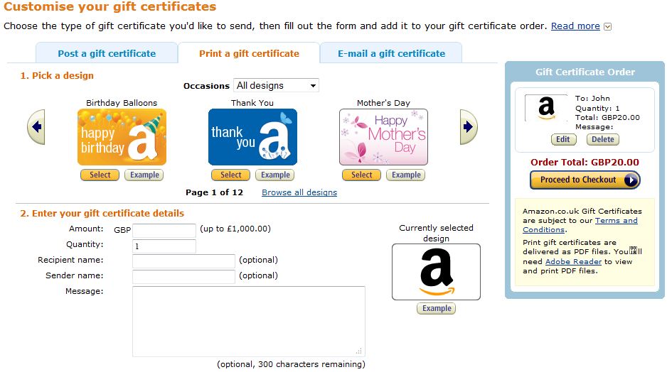 Note on Payment Verification: When you enter a payment method at the time of order, the name and card number you enter should exactly match the information on the card you are using, including spaces and stops for initials. Then, when you are asked to verify the payment method used for the printable gift certificate, the name and card number must exactly match the information you entered at the time of purchase (which should also exactly match the information on the physical card). If you enter variations of the name anywhere during the process, you may encounter problems verifying your payment and printing your gift certificate. If you are uncertain about how the name appears, you can view the cardholder name as you entered it by clicking on the "manage your payment methods" in the Payment & GC section of Your Account at www.amazon.co.uk/youraccount. You can print your gift certificate as many times as needed, but the code it contains can only be redeemed once. When the gift certificate has been redeemed to an Amazon.co.uk account, the Print gift certificate(s) button will no longer be available in the Order Summary. Back to topAre you getting an error message when you try to print your Print Gift Certificate from Your Account?If so, please try to print the Gift Certificate via the link you received in 'Your gift certificate order is ready to print' e-mail. If you still experience issues, please contact us. Back to topWhat do Amazon gift certificates look like?You can see samples of e-mail, print at home, and card gift certificates on our gift certifcates detail page. Back to top Do I have a choice of designs?Yes! If you buy a print-at-home certificate from our gift certificate page, we'll present you with a selection of available designs. If you buy an e-mail gift certificate, you can choose from a selection of available designs or you can add a photo that you've uploaded from your computer to the gift certificate design. During the purchase process, click the "click to select a design" link directly below the gift certificate image. You'll see a list of available design categories. When you find one you like, click the Select button and resume placing your order. ![]() Note: You must have JavaScript installed and enabled on your web browser to see available design options. How do I order multiple gift certificates?You can create up to 400 gift certificates on the same order. There are a few different options for you to choose from. E-Mail, Print-at-Home and Card Gift CertificatesFor each option below, you'll want to start from the gift certificates ordering page.