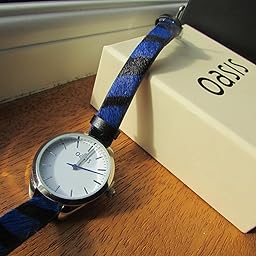The watch is good quality with the strap being stamped inside with an Oasis stamp and real leather stamp. The blue and black skin looks unusual and stands out as being different in a subtle way!! There's even an Oasis stamp on the buckle which is a cute little detail. The strap is thin at about 1cm while the face is larger at about 3cm but in my opinion just the right size. The watch comes very nicely presented in a box wrapped around a little black cushion. Perfect for a gift or treat for yourself!!!