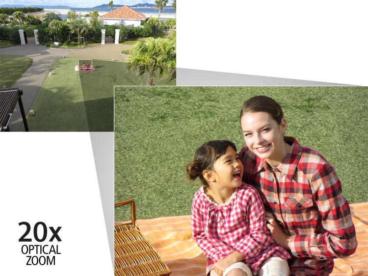 - 25 mm wide-angle lens with 20x optical zoom, extending to 39x with ZoomPlus