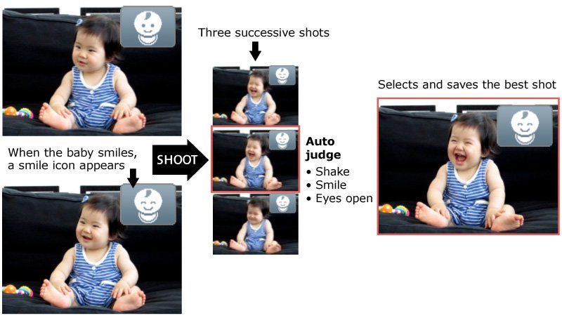 Additionally, Face ID uses the birthdays that you register to work in conjunction with Smart Auto to enable you to take better photographs in a range of different situations. For example, if Smart Auto detects a baby (0 – 2 years old) in the frame that is smiling it will automatically take multiple images and then select the best image for you.