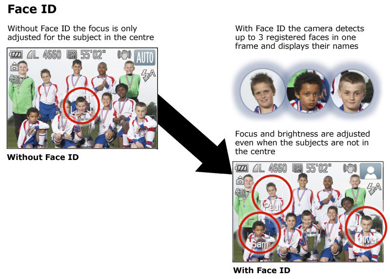 Face ID allows you to register up to 12 faces with names and birthdays so that the camera can automatically prioritise these individuals in every shot. Once the faces have been registered, Smart Auto uses the information to prioritise focus on these faces, regardless of how many other subjects are in the frame. This ensures that the camera always captures the best possible images of the people who are most important to you. It also makes it easy to search for photographs of specific friends or family members when you play back your images.