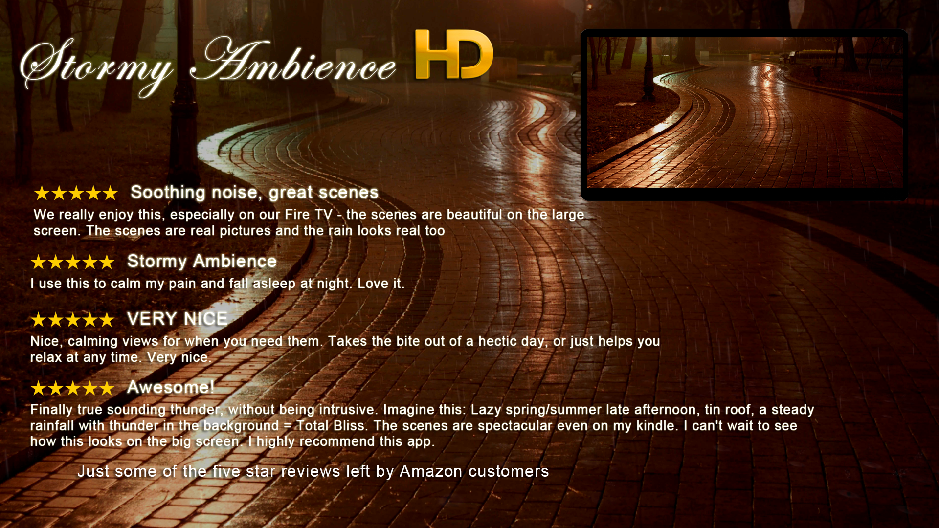 This is unbelievably authentic on Amazon Fire TV and Kindle. I personally find the sound of rain very soothing. There are several glorious scenes, not just the ones shown. You can adjust the volume of rain (menu) which comes with the occasional rumble of thunder. The scenes can be viewed in a slideshow and you can choose how often the scenes change or remain with a favourite or toggle manually through them on your control. If you choose the download on Fire TV it will also download to your Kindle. It can be purchased with coins but gives you 30 extra coins.
