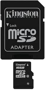 Kingston technology 16 GB microSDHC class 10 flash card with SD card adapter.