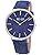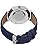 • Polished ultra-thin round case with beveled bezel on a blue denim-covered genuine leather band
