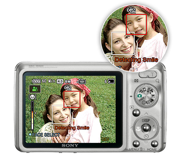 Ever had a portrait or party scene shot spoiled because your subject wasn’t smiling when the shutter clicked? Then you’ll appreciate the W220’s Smile Shutter function. In Smile Shutter mode the camera automatically takes a picture when it detects a smile, so your friends and family always look their best. You just click an icon to set the level of smile required and the camera does the rest. You can interrupt Smile Shutter by pressing the shutter button at any point if a shot looks interesting. You can also instruct it to only shoot when one of several faces is smiling. You can even set a priority for children or adults.