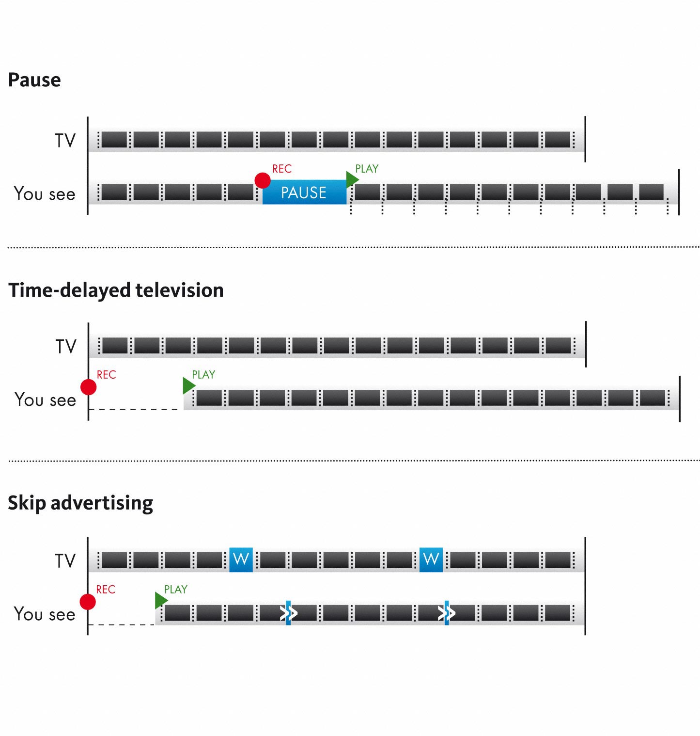 The ability to record television programmes digitally to a hard disk drive brings a host of features that were not possible with previous technology - not even with a Video Cassette Recorder (VCR). Unlike a VCR, when a programme is being recorded, you can start watching it from the beginning - before the programme has finished recording. For example, set the EPG timer to record your favourite programme at 8pm but start watching it at 8:15pm, 8:30pm or anytime that suits you. Not only is this convenient but it also allows you to forward wind through the adverts.