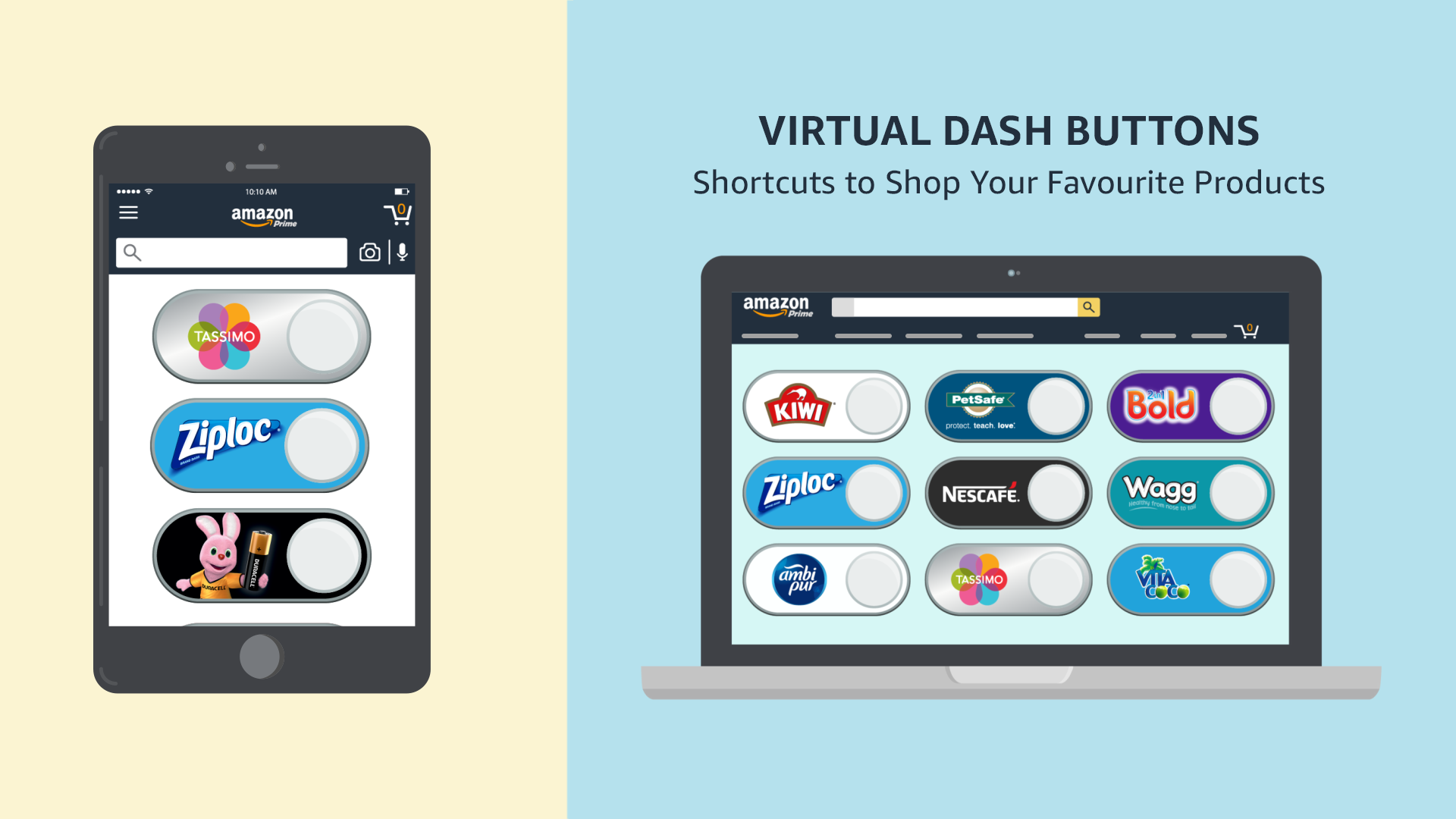 You can now use Virtual Dash Buttons online to instantly reorder your favorite products, just like you do with the Dash Button devices in your home. Exclusively for Prime members, Virtual Dash Buttons are shortcuts to quickly find and reorder your favourite products on Amazon’s mobile app and website. Virtual Dash Buttons are available for millions of products that are eligible for Prime delivery. And Virtual Dash Buttons are free, so you can add as many as you want.