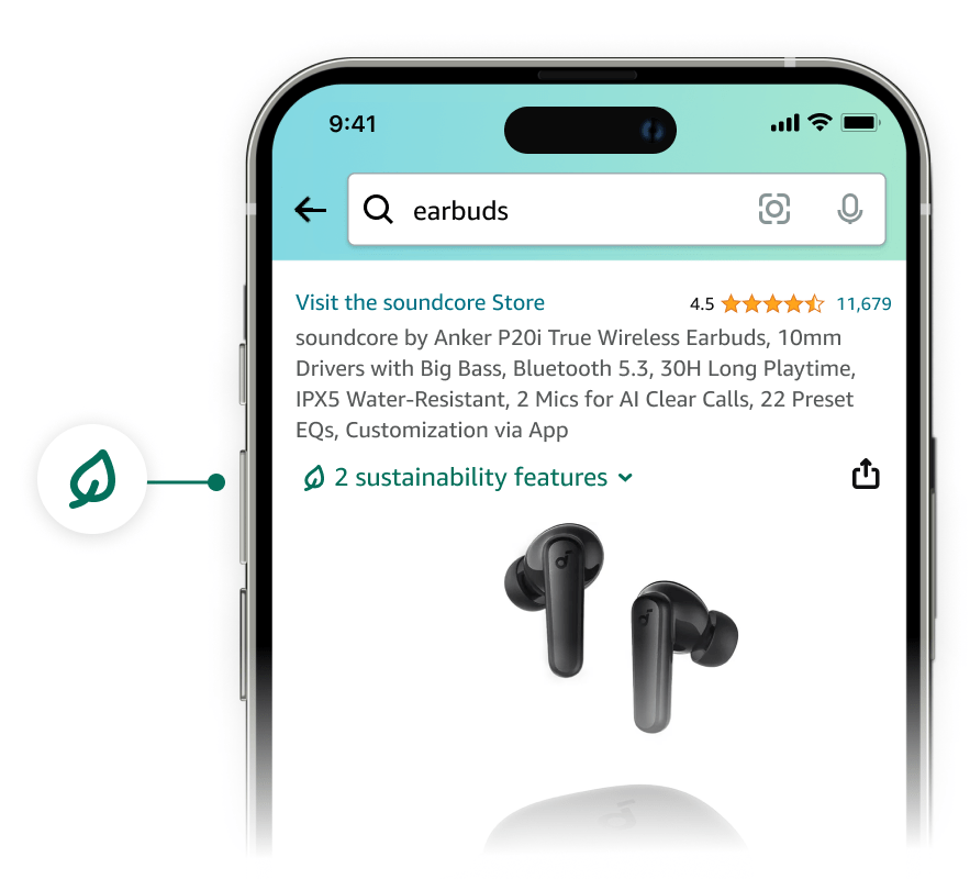 While searching for products on Amazon, you'll see the leaf logo alongside the sustainability features label on eligible products. You can also see this information on the product's detail page, where you can learn more about the sustainability features and product's certifications.