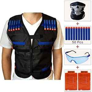 • Cosoro Kids Tactical Vest Jacket Kit (with 50pcs Blue Foam Darts + Protective Goggles Glasses + Seamless Skull Face Mask + 2 Pcs 5-dart Quick Reload Clip) for Nerf Toy Gun N-strike Elite Series